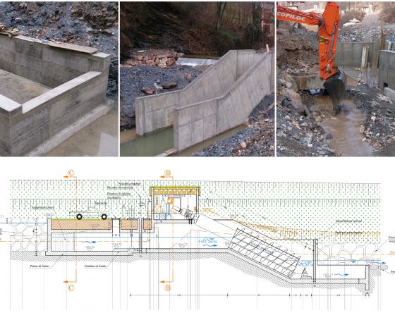 Oltre alla progettazione idraulica ed impiantistica, la realizzazione dell'impianto ha previsto il consolidamento idraulico e statico della traversa esistente attraverso la formazione di una berlinese di micropali armati a tergo del paramento verticale, collegati in testa da un importante cordolo in calcestruzzo.