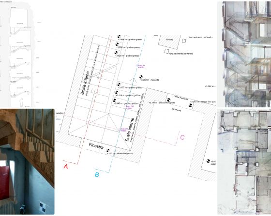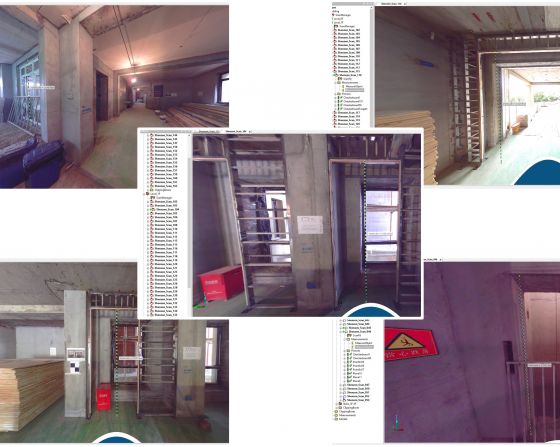 La scelta più appropriata è stata dunque quella di ricorrere a un rilievo laser scanner, eseguito nello specifico con strumentazione FARO FOCUS 3D MS 120. Tale tecnica ha permesso di acquisire in breve tempo ben 160 scansioni ad alta risoluzione in formato RGB, che sono andate a costituire un database geometrico tridimensionale dello stato di fatto, con un errore inferiore a 3mm. Da tale nuvola sono state vettorializzate direttamente tutte le informazioni geometriche alla base della progettazione quali piante e sezioni, planarità dei massetti di posa, posizione di nicchie, prese elettriche e impianti. Sono state anche eseguite verifiche di as-built rispetto al progetto architettonico.